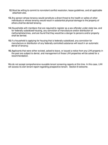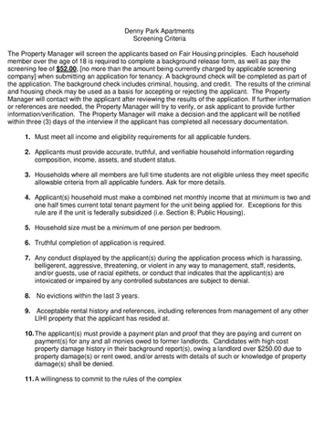 Other Criteria/Restrictions: An application needs to be completed for each household member over the age of 18, Payment of the screening fee of $52.00 is required to proceed. Valid photo identification will be required of all applicants. Additional requested documentation or information must be provided within 72 to continue the application process. Also, we do not accept comprehensive reusable tenant screening reports at this time. Section 8 welcome.