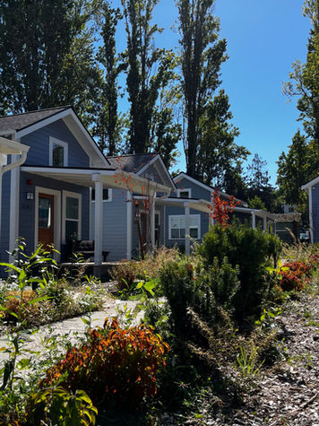 The Sand Point Cottage Community is located in Magnuson Park in North Seattle. The cottage community opened in the spring of 2020 and provides permanent supportive housing for families and individuals. Sand Point is comprised of 22 fully-furnished cottages with a bedroom, living area, kitchen, bathroom, loft, and porch. The community also includes a common building, community garden, outdoor recreation space, and walking paths. The cottages were built modularly off-site by students in pre-apprenticeship and vocational training programs.